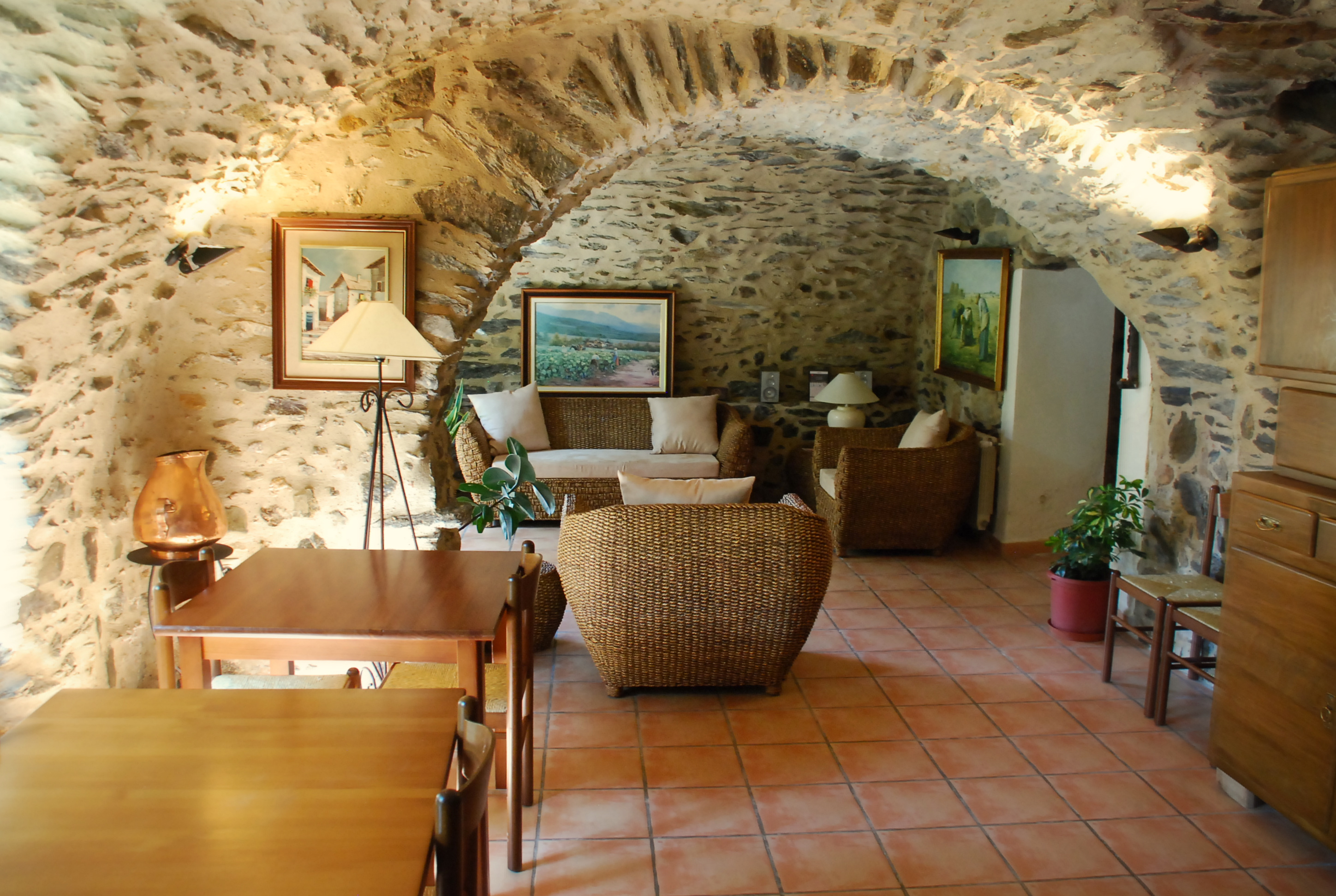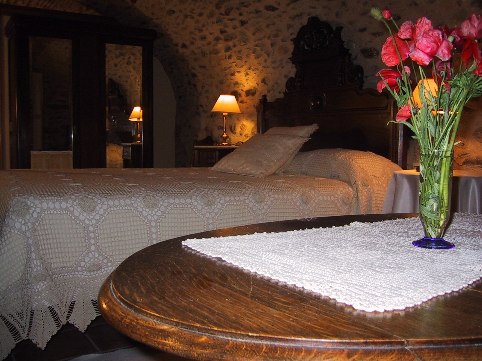 < Go back to "BEDROOMS"Double room on the ground floor, dressed with Catalan vault, stone walls and antique furniture: Alfonsino bed, ditada chest of drawers, wardrobe from the beginning of the 20th century, Alfonsino armchairs, English-style table and Thonet chairs.