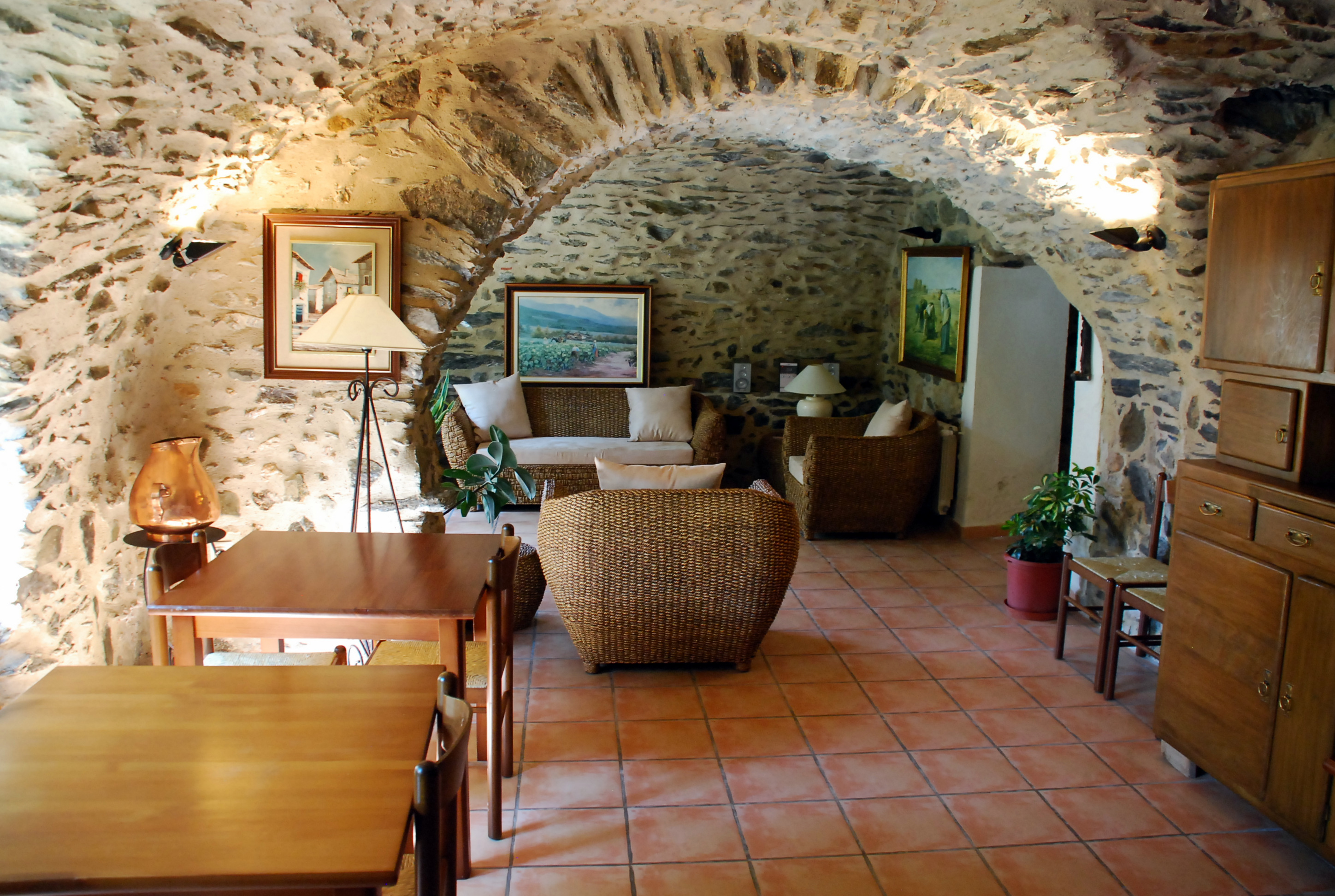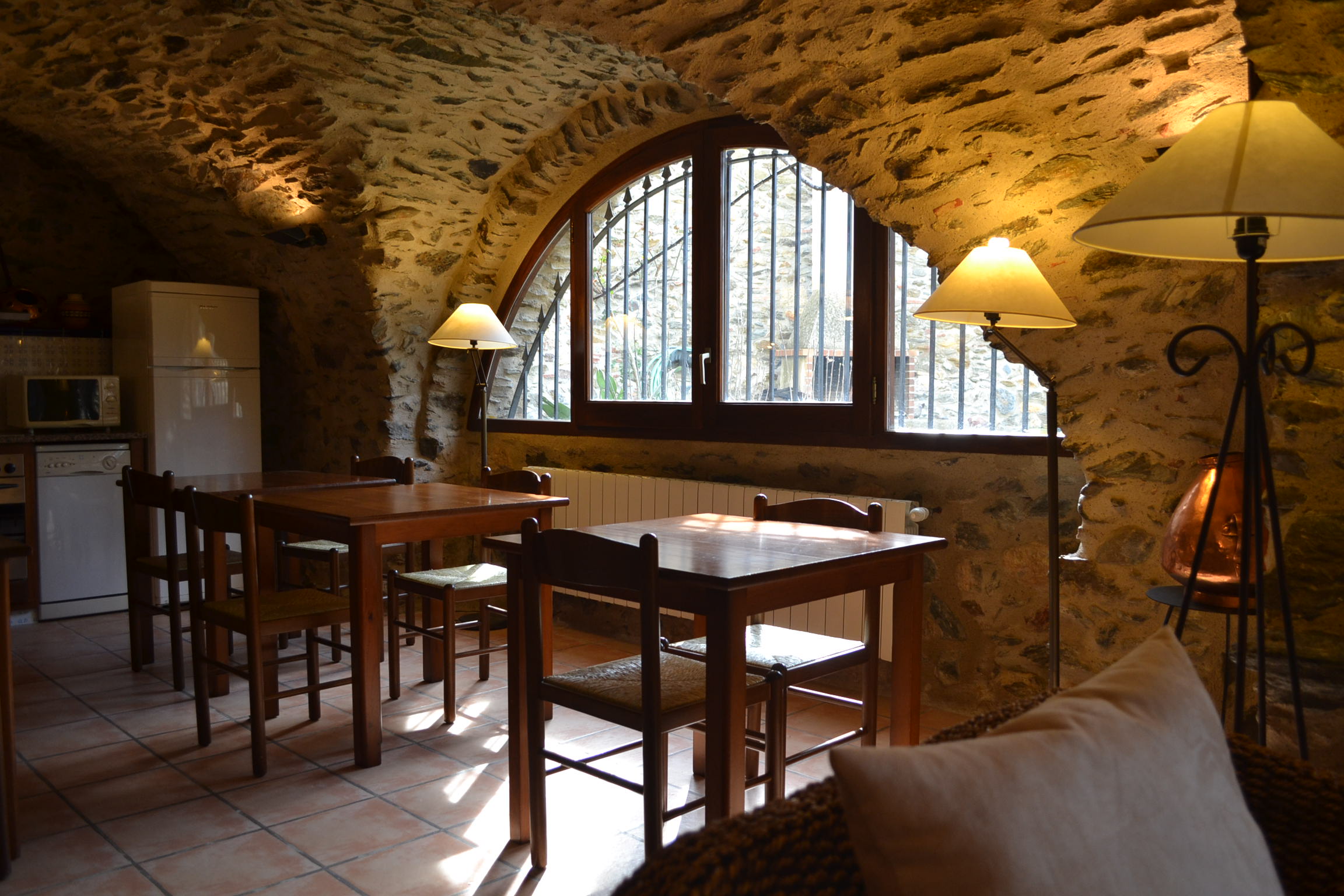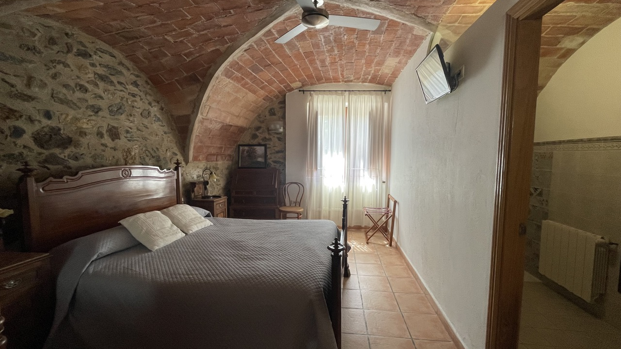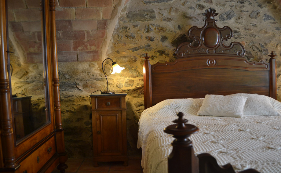< Go back to "BEDROOMS"Double room on the ground floor, featuring a traditional Catalan vaulted ceiling and stone walls, furnished with antique pieces: an Isabeline-style bed, "La Ditada" style dresser, an Alfonsí wardrobe and Thonet chairs.